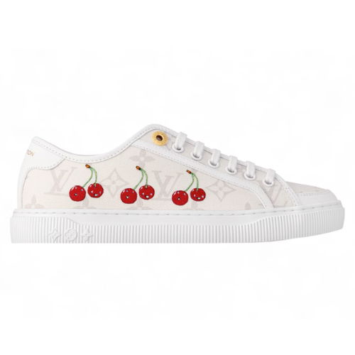 El Louis Vuitton Cherry LV Lagoon Sneaker x Takashi Murakami White (1AHKYU) es una sutil y artística fusión entre el mundo del lujo y el estilo pop del artista Takashi Murakami. Se presenta en base blanca con detalles florales tipo “cherry” y gráficos multicolores inspirados en el tema Lagoon / LV, aprovechando el universo visual del artista