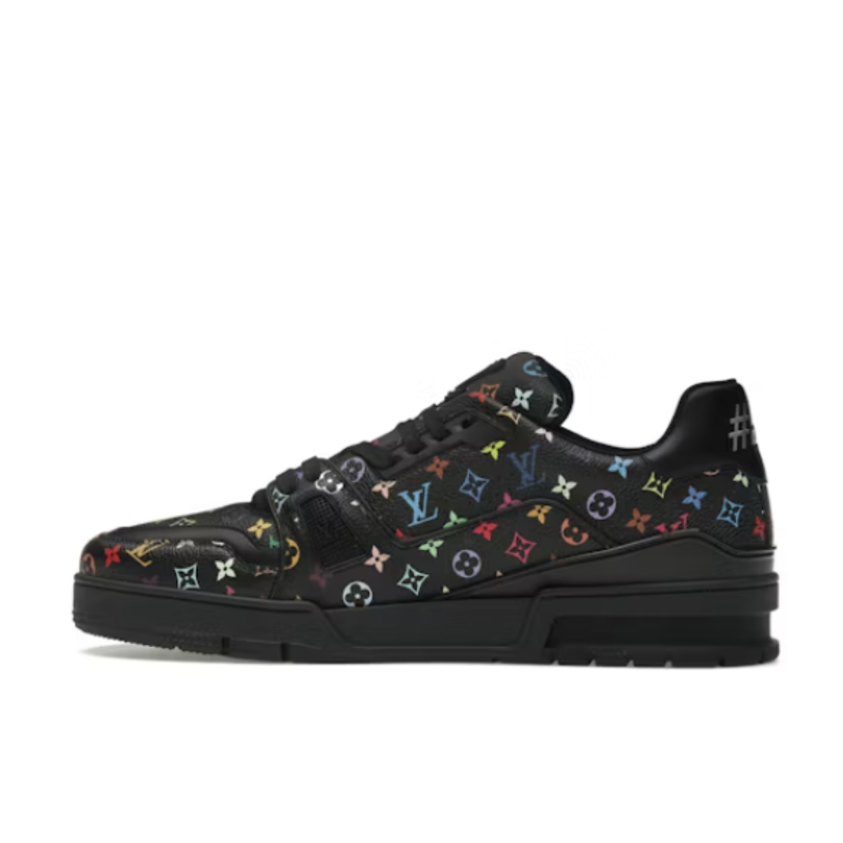 el icónico diseño LV Trainer con la estética artística de Takashi Murakami. Se presenta en un esquema de color negro con detalles multicolores, resaltando su carácter exclusivo. La silueta mantiene la forma robusta del Trainer tradicional, mientras incorpora elementos gráficos y acabados de alta calidad que reflejan una colisión entre arte contemporáneo y lujo