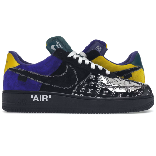 El Louis Vuitton Nike Air Force 1 Low By Virgil Abloh Black Metallic Silver es una edición lujosa de la colaboración LV × Nike diseñada por Virgil Abloh. Combina una base negra con acentos metálicos plateados, tonos amarillos y toques en azul real para un contraste visual sofisticado