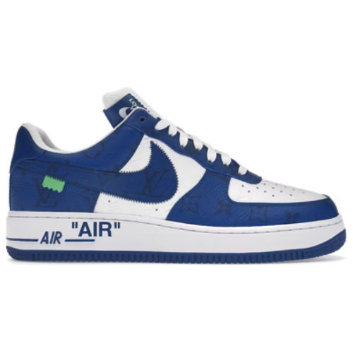 Tenis LV × Nike AF1 White / Royal (Virgil Abloh): blanco con acentos azul real, mezcla de lujo y herencia deportiva