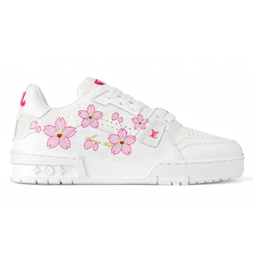 El Louis Vuitton LV Trainer Takashi Murakami Cherry Blossom White (1AGZEJ) es una versión colaborativa que celebra la estética floral característica de Takashi Murakami. Este par está confeccionado en blanco con motivos florales multicolor inspirados en el cerezo (Cherry Blossom) distribuidos a lo largo del calzado