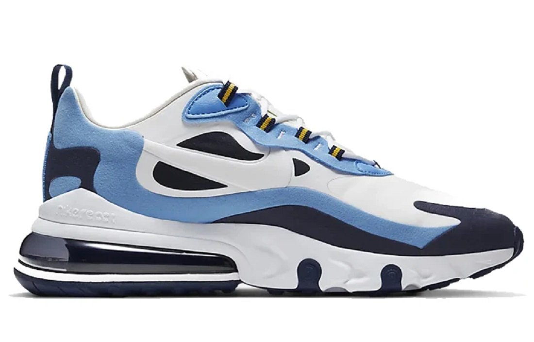 Las Nike Air Max 270 React “Midnight Navy” lucen una paleta de colores inspirada en el estilo universitario en su parte superior sin costuras, confeccionada con una mezcla ligera de tejido sintético, ante y cuero. Su base blanca nítida se acentúa con superposiciones sin costuras en azul marino y azul universitario, junto con toques amarillos en contraste en las presillas de los cordones. La entresuela de espuma Nike React proporciona una pisada suave, mientras que la unidad 270 Max Air visible ofrece mayor amortiguación bajo el talón.